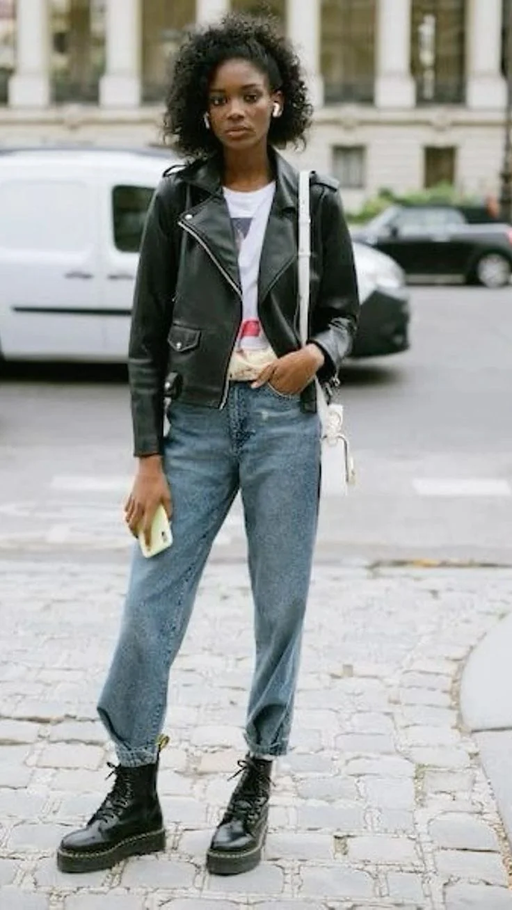 Короткие куртки: Косухи бомберы джинсовые куртки — идеальны для создания баланса объемов. Они подчеркивают талию и не утяжеляют низ. Кожаная косуха с багги — это прямо бомба для вечера.